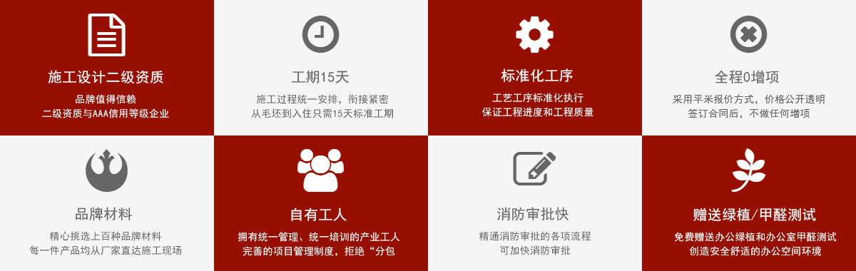項(xiàng)目均實(shí)行直營(yíng),無(wú)外包風(fēng)險(xiǎn),依托自有設(shè)計(jì)、施工、項(xiàng)目管控、售后服務(wù)體系,一站式裝修服務(wù)
